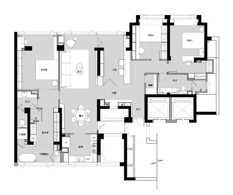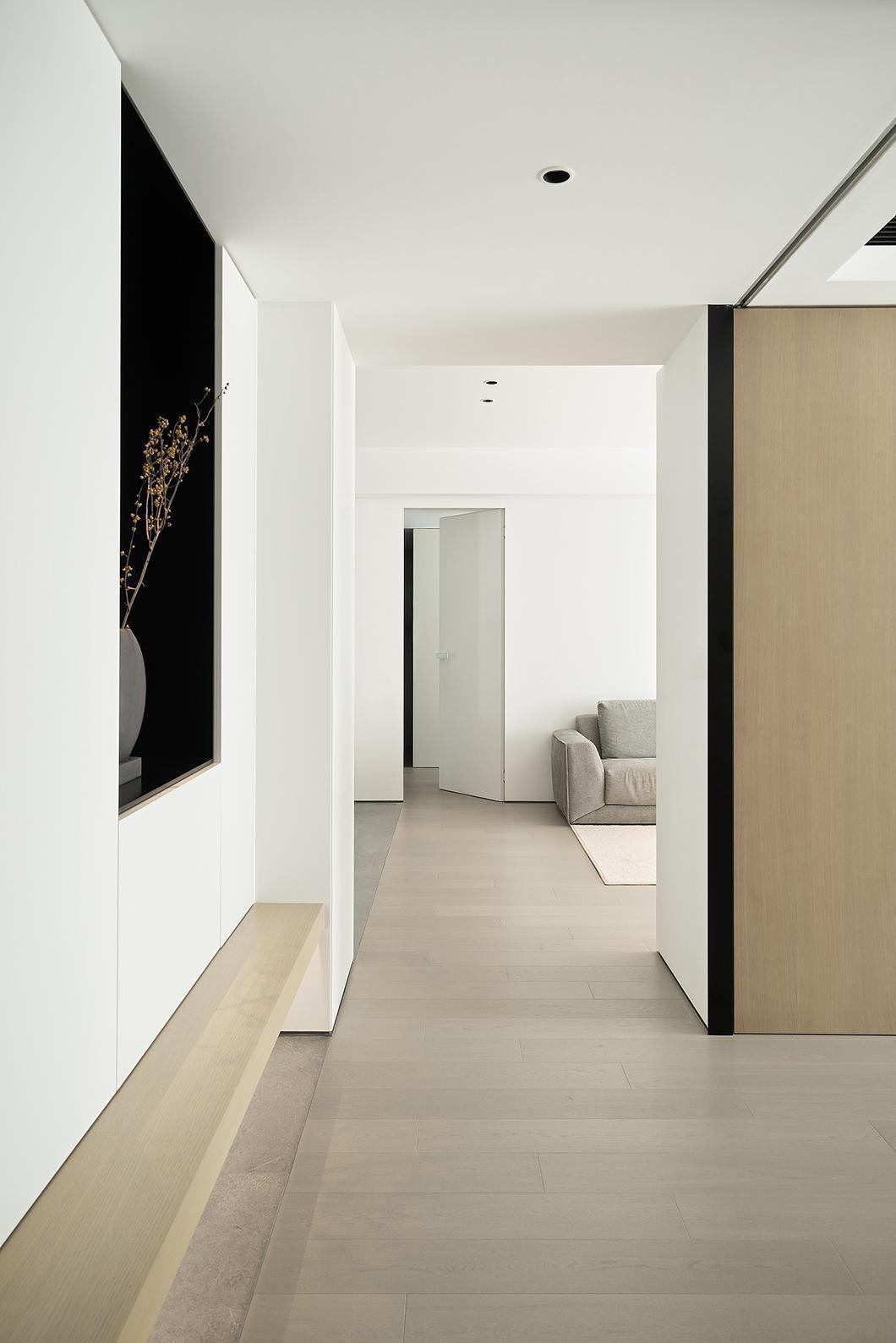 本案原是两套小户型,将之调整后并成一套平层户型设计,两套户型的合并打破了原有格局的功能性,需对空间布局进行调整优化,将空间化零为整,此所谓加法。